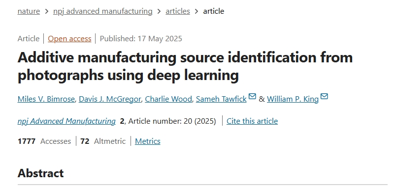 2025年5月28日,伊利诺伊大学的研究人员利用人工智能技术开发了一种可以准确识别出3D打印零件的制造设备、工艺和材料的方法,标志着增材制造溯源与质量监管进入了一个新的阶段。