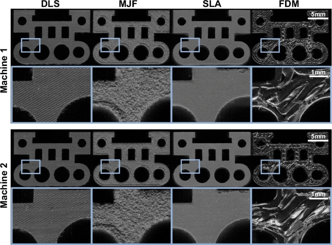 在实验中,团队使用21台商用3D打印机生产了9192个零件,覆盖四种主流增材制造工艺:数字光合成(DLS)、多喷射熔合(MJF)、立体光刻(SLA)和熔融沉积成型(FDM)。每个零件都通过平板文档扫描仪以5.3微米/像素的高分辨率扫描,构建出详尽的图像数据库供模型训练与验证使用。