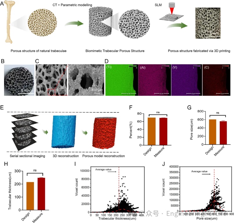 作者首先描述了生物仿生松质骨结构(BTPS)的设计、制造和表征过程。作者利用沃罗诺伊算法结合影像数据设计出模仿股骨松质骨解剖结构的BTPS,其具有600微米的孔径和70%的孔隙率,展现出各向异性和相互连通的多孔结构,实现了与自然骨结构的高度相似性。通过选择性激光熔化(SLM)技术成功制造了这种具有生物仿生多孔松质骨设计的Ti-6Al-4V支架(图2A)。对BTPS的结构和组成进行了全面评估,SEM成像显示BTPS表面光滑、孔壁厚度均匀(图2B、C),EDS验证了该支架主要由钛(Ti)、铝(Al)和钒(V)组成(图2D);工业CT扫描验证了内部完整性和连通性,孔径分析显示平均孔径为560微米,平均松质骨厚度为248微米(图2E-J)。结果表明BTPS实现了预期的结构精度和均匀性,其弹性模量约为3.2 GPa,渗透率为11.52 × 10⁻⁸ mm²,与自然骨的力学性能和渗透性相匹配。