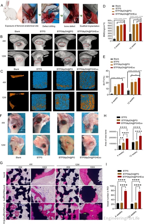最后,作者对该复合材料在体内骨缺损修复中的应用效果进行了动物实验验证。作者在兔股骨缺损模型中植入了四种不同类型的支架(空对照组、BTPS组、BTPS&pDA@PG组和BTPS&pDA@PGHExo组),并在术后4周和12周分别进行了Micro-CT和组织病理学分析(图8A-E)。结果显示,BTPS&pDA@PGHExo组在新骨体积和密度方面显著高于其他组,特别是在4周时新骨体积达到19.3 mm³,骨密度达到653.9 mg cm⁻³,12周时分别增加至28.1 mm³和717.1 mg cm⁻³(图8B-E)。组织病理学分析(图8F-I)进一步揭示了BTPS&pDA@PGHExo组在缺损部位显著促进了新骨形成和更密集的血管网络。早期(4周)便观察到明显的新生骨和血管,至12周时骨进一步成熟且血管密度增加。定量分析表明,BTPS&pDA@PGHExo组在两个时间点的新骨体积和血管密度均显著高于对照组。