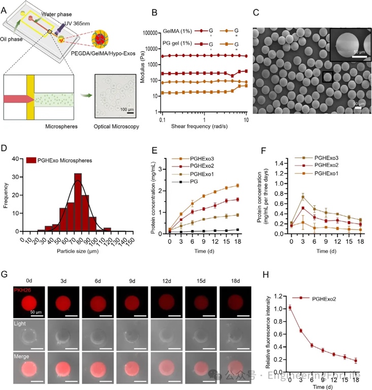 随后,作者通过微流控芯片技术成功制备了负载缺氧诱导外泌体(Hypo-Exos)的双网络水凝胶微球(PGHExo),并对其进行了表征。作者发现PGHExo微球表面光滑、内部结构均匀,粒径分布集中且平均粒径约为80微米(图5A、C、D)。流变学分析表明,与单组分GelMA凝胶相比,PEGDA/GelMA双网络凝胶具有更高的储能模量和损耗模量,显示出更好的力学稳定性(图5B)。在蛋白释放特性方面,不含Hypo-Exos的PG样本在18天内几乎无蛋白释放,而含Hypo-Exos的样本则表现出持续的蛋白释放,且释放速率与Hypo-Exos浓度正相关(图5E)。特别地,PGHExo2(含2 mg mL⁻¹ Hypo-Exos)在18天内持续释放,平均释放浓度约200 μg mL⁻¹,该浓度是诱导血管生成的最佳浓度(图5F)。此外,通过共聚焦显微镜观察PKH26标记的Hypo-Exos释放情况发现,PGHExo2微球能持续释放Hypo-Exos长达18天(图5G),免疫荧光成像和定量荧光分析结果一致,证实了双网络微球中有效的Hypo-Exo释放(图5H)。