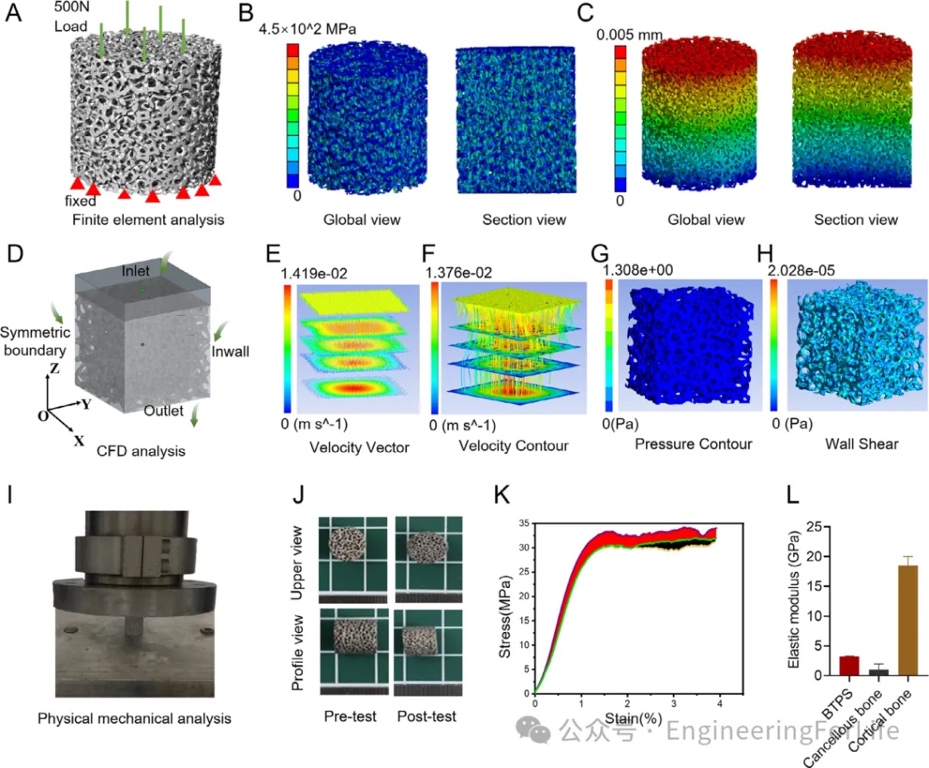 进一步,作者对BTPS进行有限元分析、力学测试和流体动力学分析的过程。通过有限元分析评估了BTPS在受载情况下的力学稳定性,结果显示最大应力为454.26 MPa,应力分布均匀,最大位移为0.005 mm,表明BTPS具有良好的变形抗力(图3A-C)。流体动力学评估了BTPS的渗透性和流体传输特性,结果显示BTPS内流速均匀,流体顺畅通过孔隙结构,无湍流或停滞现象,渗透率为11.52 × 10⁻⁸ mm²,表明其具有较高的流体传输能力(图3D-H)。物理力学测试进一步验证了BTPS的力学性能,其弹性模量为3.2 GPa,与松质骨和皮质骨的弹性模量范围相符,且平均屈服压缩载荷为3085.25 N,表明BTPS具有足够的力学强度以支持骨组织修复和维持结构完整性(图3I-L)。