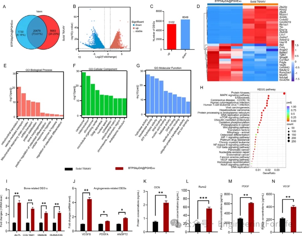 基于其体外良好的生物活性,作者进一步对BTPS&pDA@PGHExo进行了mRNA测序分析,以探究其对基因表达的影响。与对照组相比,BTPS&pDA@PGHExo处理组中有5102个基因表达上调,6049个基因表达下调(图7A-D)。GO富集分析揭示了关键的生物学过程,如线粒体功能、骨形态发生和缺氧诱导的血管生成(图7E-G)。KEGG通路分析则突出了包括MAPK、mTOR、HIF-1和VEGF在内的关键信号通路,这些通路是成骨和血管生成的重要调控者(图7H)。通过热图分析,作者进一步强调了与骨功能相关的显著基因(如ALPL、COL18A1、SAMD6和RUNX2OS1)以及与血管生成相关的基因(如VEGFB、PDGFA和ANGPT2)。为了验证RNA测序结果,作者对关键的成骨和血管生成差异表达基因(DEGs)进行了定量实时PCR(qRT-PCR)分析(图7I,J),结果表明BTPS&pDA@PGHExo组中RUNX2、OCN、PDGF和VEGF的蛋白表达水平显著增加(图7K-N)。