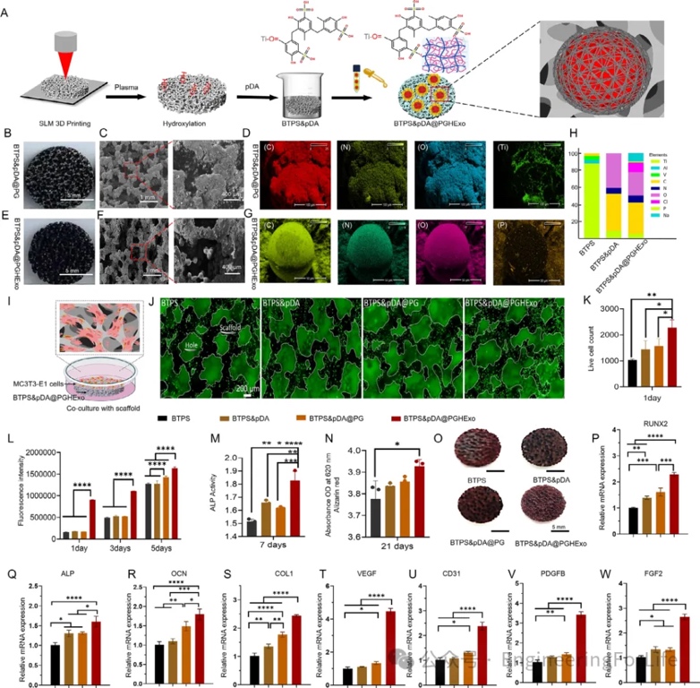 作者在此部分主要描述了BTPS&pDA@PGHExo复合材料的制备过程及其体外生物活性评估。通过等离子体处理和多巴胺涂层(pDA)修饰将PGHExo微球固定在BTPS表面,形成稳定的复合结构(图6A-D)。SEM和EDS确认了pDA涂层的成功修饰以及PGHExo微球在BTPS表面的良好分布(图6E-H)。细胞活性实验表明,BTPS&pDA@PGHExo组展现出显著更高的细胞活力和增殖能力(图6I-K,L)。此外,该复合材料还显著提升了MC3T3-E1细胞的成骨分化能力,表现为更高的碱性磷酸酶(ALP)活性和矿化结节形成能力(图6M-O)。同时,BTPS&pDA@PGHExo组在促血管生成方面表现出色,表现为血管内皮生长因子(VEGF)等促血管生成基因的显著上调(图6P-W)。