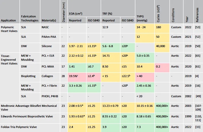 通过对比ISO标准下的关键指标(EOA、TRF、TVPG),研究了3D打印瓣膜与市售机械瓣、生物瓣的功能差异。结果表明,部分3D打印瓣膜(如MEW复合TEHV)的有效开口面积(EOA)和跨瓣压力梯度(TVPG)优于临床产品,但疲劳循环次数(最高4000万次)尚未完全满足ISO要求(2亿次),显示出在流体力学上的潜力与耐久性提升空间。