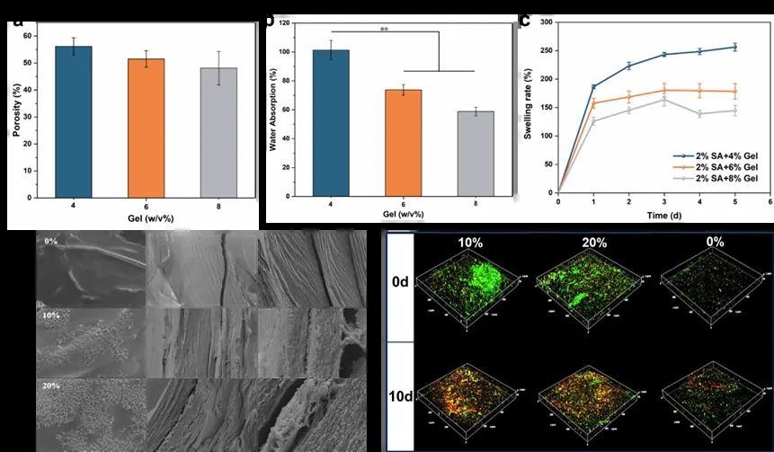 3D好氧反硝化活体材料具备良好的孔隙率、吸水率与溶胀率,凝胶基质内部形成了高效基质输运通道。另外,毛细效应驱动的水/污染物扩散渗透体系不仅持续供给反硝化菌代谢底物,更能有效排出代谢产物避免抑制效应,最终形成了适宜反硝化菌生态位的稳定微环境。