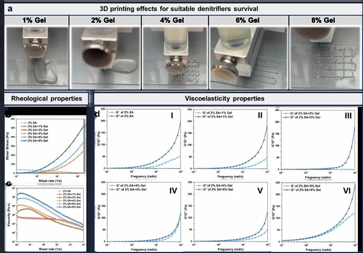 优化SAG生物墨水中SA/Gel配比,所得最优生物墨水实现了良好的3D打印成型效果,以确保反硝化细菌生态位的稳定保持。同时,所设计的生物墨水具备良好流变特性,打印细丝可流畅挤出保持不坍塌,在保护菌体抗机械剪切的同时又可维持结构完整性,为构建兼具高细菌活性和机械强度的3D好氧反硝化活体材料提供保障。