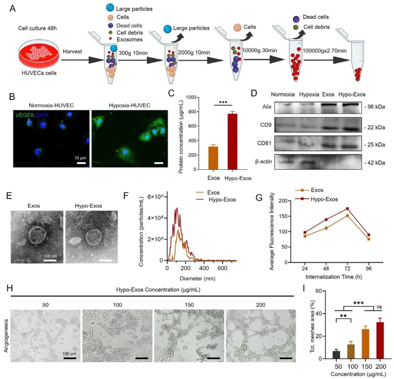 3. 低氧诱导外泌体(HExo)的提取与表征,通过多步超速离心从低氧培养的HUVECs中分离外泌体,利用TEM、纳米颗粒跟踪分析(NTA)及Western blot检测,结果显示HExo呈球形、粒径约100 nm,低氧条件下VEGFA表达及蛋白浓度显著高于常氧组,且对HUVECs的促血管形成能力呈剂量依赖性(200 μg/mL时血管网络面积最大)。