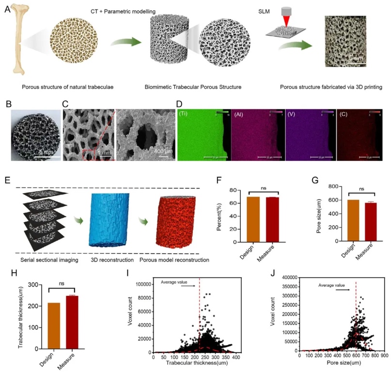 1. 仿生小梁钛支架的设计与制备,通过Voronoi算法结合股骨松质骨CT数据建模,并利用选择性激光熔融(SLM)3D打印技术,制备了孔隙率70%、平均孔径560 μm的BTPS钛支架。通过扫描电子显微镜(SEM)、能谱分析(EDS)及工业CT验证,结果显示支架表面光滑、元素分布均匀(Ti/Al/V比例符合Ti-6Al-4V标准),内部孔隙连通性良好,力学测试表明其弹性模量为3.2 GPa,接近天然松质骨。