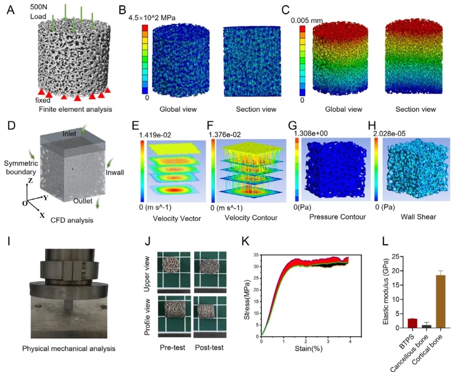 2. 支架力学性能与流体动力学分析,采用有限元分析(FEA)模拟支架在500 N压缩载荷下的应力分布,结果显示最大应力454.26 MPa,无应力集中;计算流体动力学(CFD)显示支架内流体流速均匀(无湍流),渗透率为11.52×10⁻⁸ mm²,证实其力学稳定性和物质传输效率。压缩测试进一步验证支架屈服载荷达3085.25 N,符合承重需求。