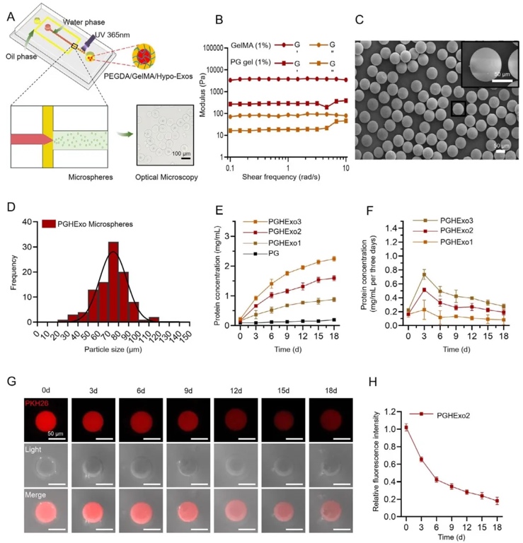 4. PEGDA/GelMA水凝胶微球(PGHExo)的制备与释放特性,利用微流控芯片技术制备平均粒径80 μm的双网络水凝胶微球,通过流变学测试证实其储能模量(G′)高于单一GelMA凝胶,体外释放实验显示HExo呈持续释放模式(18天累计释放率约80%),荧光追踪显示微球在体内外均能稳定释放外泌体达4周以上。