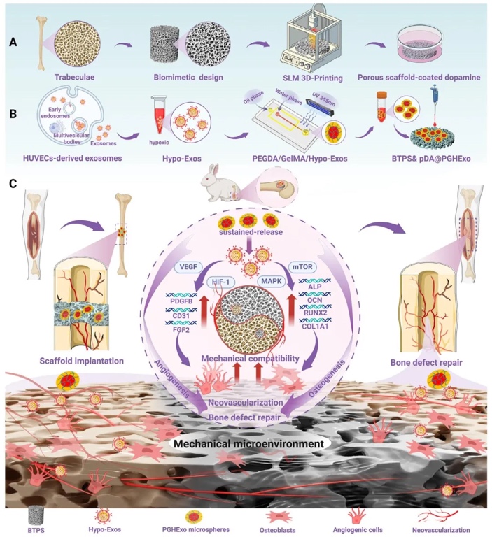 相关工作以“3D-Printed Titanium Trabecular Scaffolds with Sustained Release of Hypoxia-Induced Exosomes for Dual-Mimetic Bone Regeneration”为题发表在《Advanced Science》上。