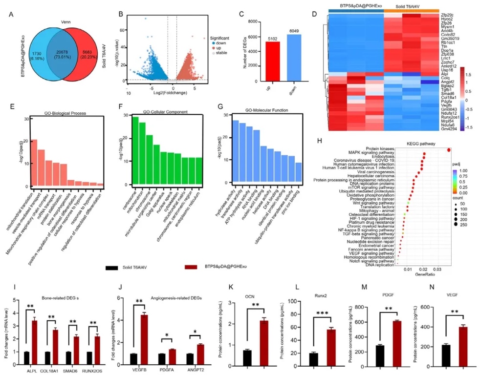 6. 支架诱导骨再生的转录组学机制分析,通过mRNA-seq对比BTPS&pDA@PGHExo与纯钛支架组的基因表达,GO富集分析显示差异基因显著富集于“骨骼发育”“血管生成”“MAPK/mTOR/HIF-1信号通路”,RT-PCR及ELISA验证ALPL、VEGFB等关键基因和蛋白(RUNX2/VEGF)的上调,揭示外泌体通过激活多通路协同促进骨再生。