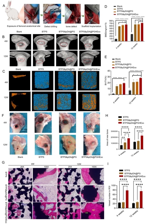 7. 兔股骨缺损模型的体内修复效果,通过显微CT(μCT)和组织学染色(亚甲蓝-品红)评估,结果显示BTPS&pDA@PGHExo组在12周时新骨体积(28.1 mm³)和骨密度(717.1 mg/cm³)显著高于对照组,新生血管密度及成熟骨小梁结构形成量最优,证实其通过结构仿生与外泌体缓释的双重作用实现功能性骨再生。
