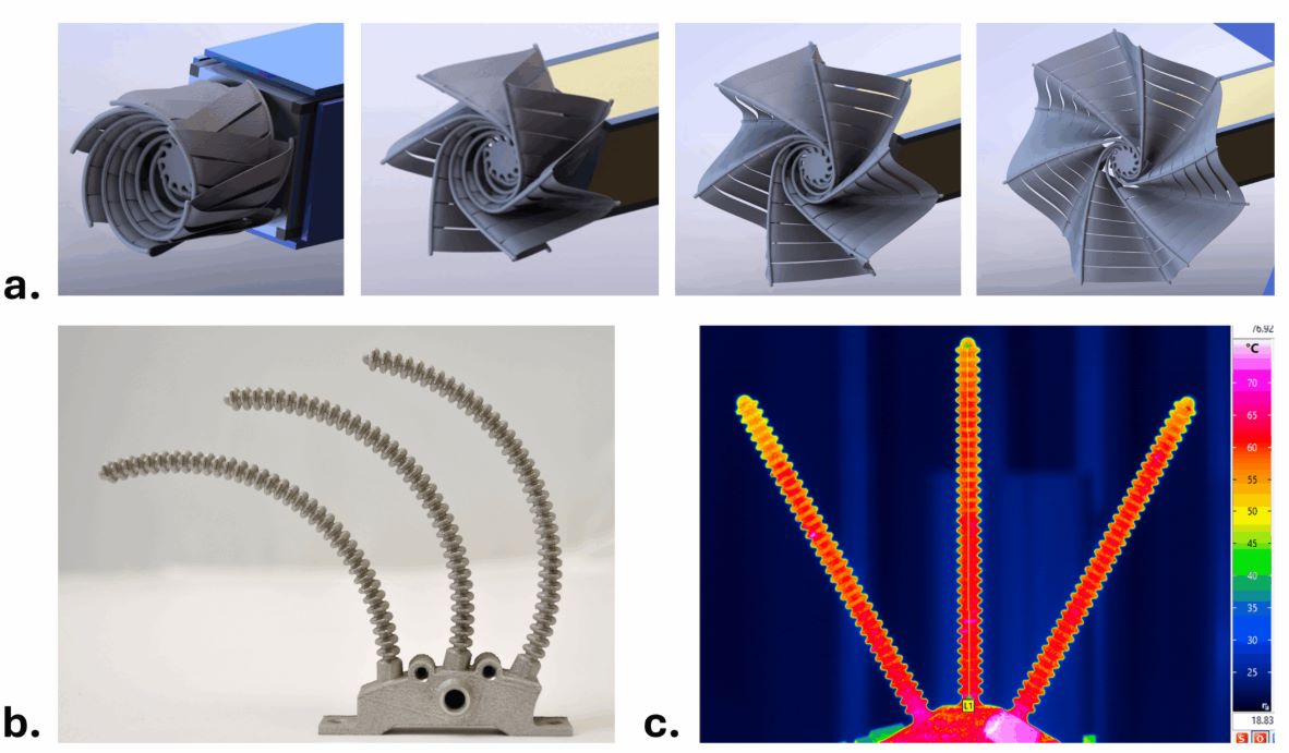 △a. 增材制造形状记忆合金 (SMA) 散热器概念图,其径向热管分支可从紧凑的收纳状态展开。b. 带有高柔顺性波纹管热管臂的 SMA 原型演示器。c. SMA 分支波纹管热管的热图像,显示其工作状态接近等温。