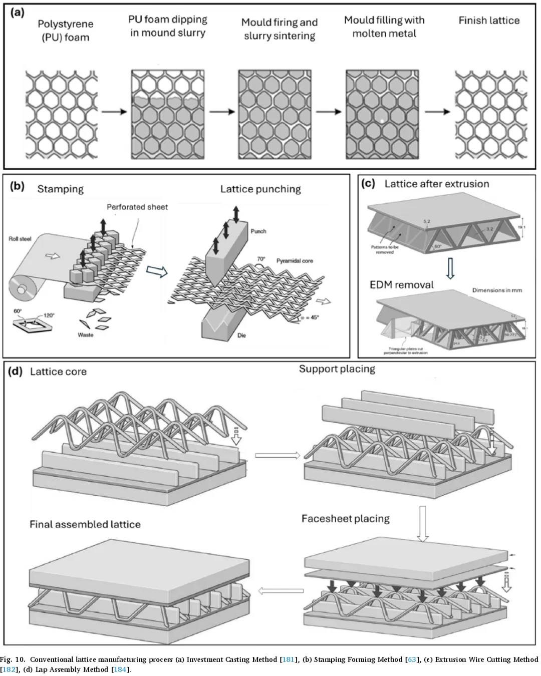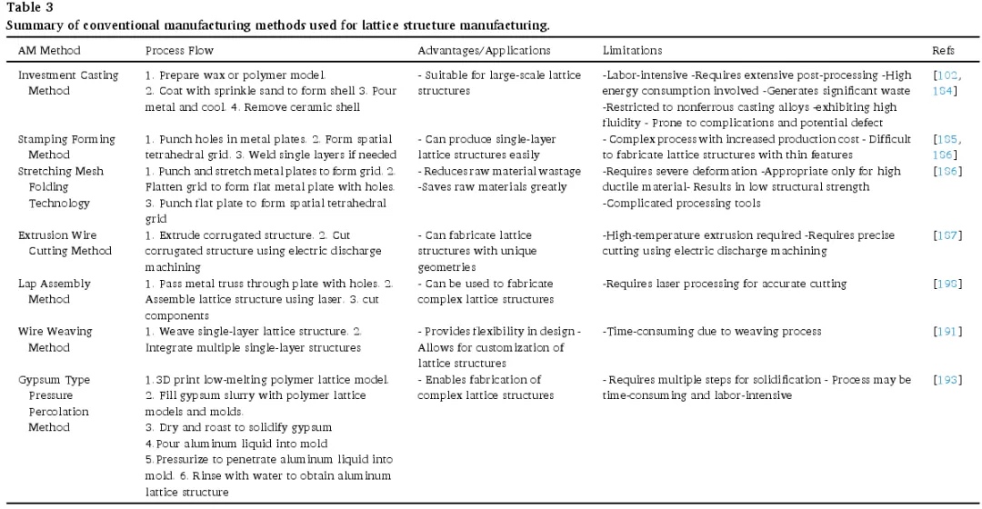 此外,这些方法在制造具有细长肋和面板的晶格结构时也面临困难。库伊斯特拉提出了拉伸网折叠法和冲孔网拉伸法。拉伸网折叠法的优点是可以利用原始金属板制造板网,从而最大限度地减少原材料浪费并节约资源。然而,这些方法在制造过程中对变形要求较高,限制了其仅适用于高延展性材料,这会导致结构强度较低且工艺要求复杂。此外,冲压成型法会产生大量的材料浪费。因此,尽管传统制造方法具有一定的优势,但在制造晶格结构时也存在明显的局限性。下表 3 总结了用于晶格结构制造的传统制造方法,包括其工艺流程、优点、局限性和应用。图 10 展示了部分制造过程的示意图。