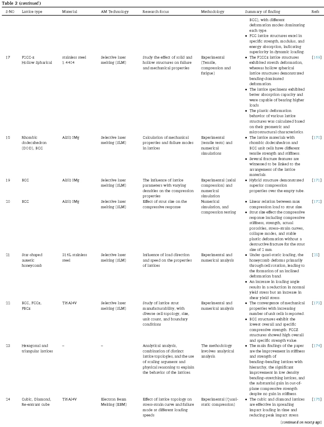 此外,文献中探索了多种用于制造晶格结构的材料,以改善其设计性能。例如,铝、钛和钢合金等金属材料通过选择性激光熔化(SLM)和选择性激光烧结(SLS)用于晶格制造。同样,聚合物和复合材料也被研究用于减轻重量和改善机械性能。这些材料的选择是基于它们与增材制造工艺的兼容性以及在各种工业应用中增强晶格结构功能和性能的潜力。下表 5 详细列出了适合增材制造晶格结构的材料,展示了每种增材制造方法的类型、使用的材料以及典型的晶格结构。