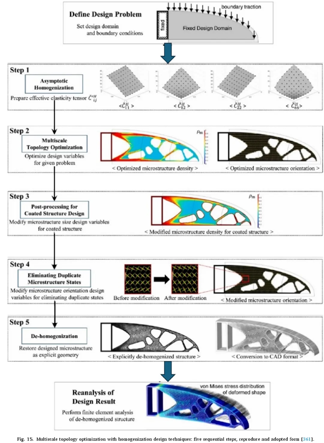 然而,增材制造带来了诸如精度、连通性、支撑结构和材料属性等独特挑战,需要采用全面的增材制造设计方法。增材制造设计将产品设计和制造相结合,在考虑增材制造约束和机遇的同时优化设计,以实现性能最大化。传统的顺序设计过程往往限制了拓扑优化和增材制造的全部潜力。为了克服这一问题,当前的研究重点是设计适合增材制造的高性能多尺度结构,并将增材制造约束纳入优化过程,以实现设计和制造的持续集成。人们探索了各种拓扑优化方法(如下所述),包括通过基于密度的方法(SIMP)、基于均匀化的方法和多尺度拓扑方法进行晶格结构设计。