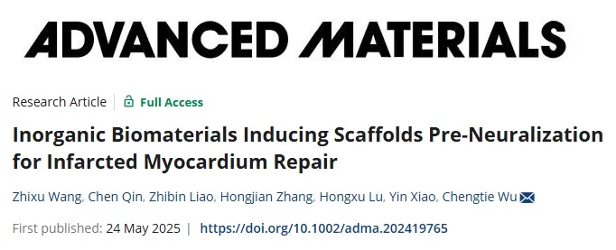 针对上述痛点,中国科学院上海硅酸盐研究所吴成铁研究员团队开发了基于3D生物打印技术的“预神经化”支架。该团队将硅酸锶(SrSiO₃)微粒子与NSCs结合,利用3D打印构建多孔支架,通过Sr²⁺和Si²⁻离子释放诱导NSCs定向分化为成熟神经元,形成具有神经调节功能的活性支架。体内外实验表明,该支架可增强心肌细胞成熟和同步收缩,激活昼夜节律相关基因(如Per2、Usp24)促进心肌修复,改善心梗大鼠心脏功能。相关工作以“Inorganic Biomaterials Inducing Scaffolds Pre㎞euralization for Infarcted Myocardium”为题发表在《Advanced Materials》上。论文第一作者为上海硅酸盐所博士研究生王之栩,通讯作者为吴成铁研究员。