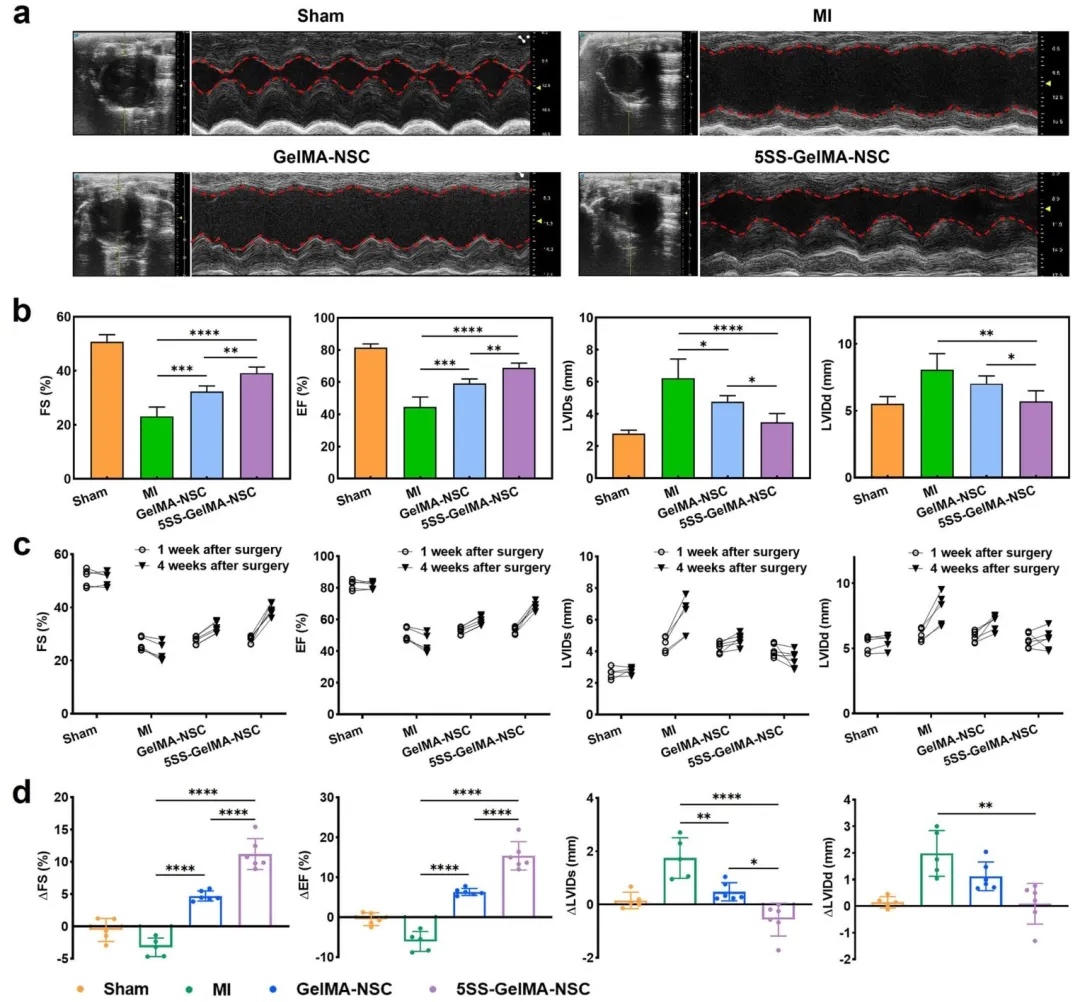 5. 预神经化支架的体内心肌修复效果,利用大鼠心肌梗死模型、超声心动图和组织染色(Masson’s Trichrome、WGA等),评估了支架植入后的心脏功能及组织修复。结果表明,5SS-GelMA-NSC组大鼠左心室射血分数(EF)和缩短分数(FS)显著提升,梗死面积减少,心肌细胞肥大减轻,且促进血管新生(vWF+和α-SMA+血管密度增加)。