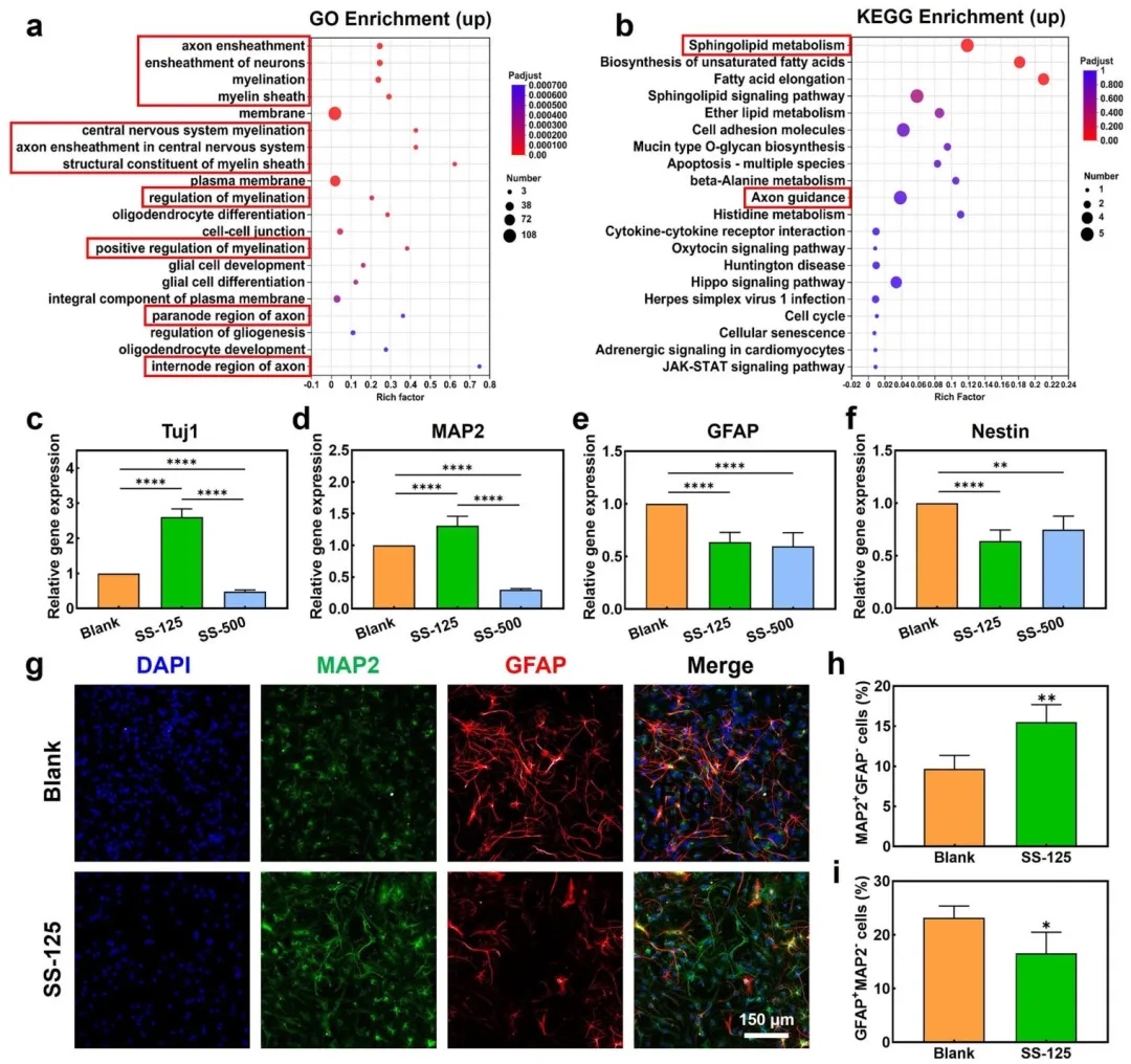 3. 硅酸锶促进NSCs分化的机制,通过转录组测序、离子浓度梯度实验和免疫荧光染色,分析了SS调控NSCs分化的分子通路及离子作用机制。结果表明,SS通过激活轴突导向和鞘脂代谢相关基因(如MAP2),且Sr/Si离子浓度为125 μg/mL时可有效诱导神经元成熟,过高浓度(500 μg/mL)则具细胞毒性。