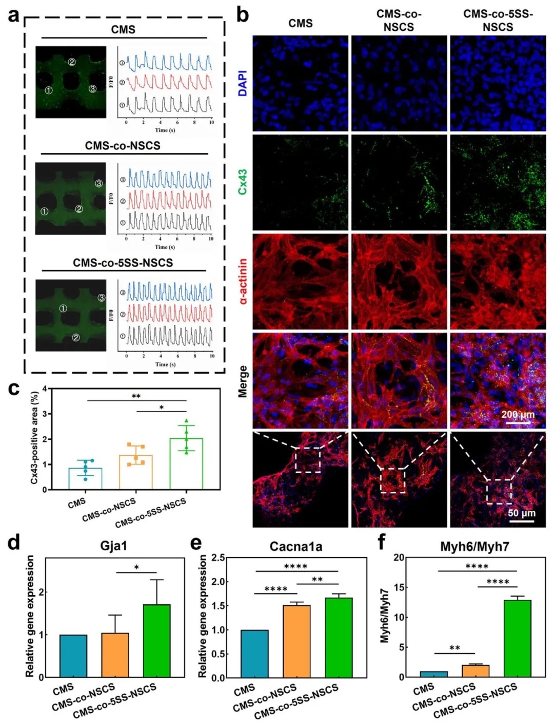 4. 预神经化支架对心肌构建体的体外作用,通过钙瞬变实验、免疫荧光染色和基因表达分析,研究了预神经化支架与心肌细胞共培养时的功能调控。结果显示,5SS-GelMA-NSC支架显著增强心肌细胞搏动同步性(钙信号同步化)、连接蛋白Cx43表达及收缩相关基因(Myh6/Myh7)活性,促进心肌结构成熟。
