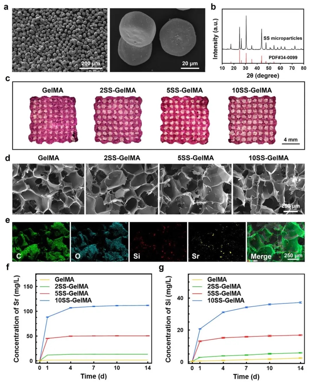 1. 硅酸锶微粒子及3D打印支架的表征,通过扫描电子显微镜(SEM)、X射线衍射(XRD)、流变学分析和离子释放实验等方法,研究了不同浓度硅酸锶(SS)微粒子(0%、2%、5%、10%)的形貌、物相、生物墨水打印性能及Sr/Si离子释放规律。结果表明,SS微粒子呈六方棱柱形,5SS-GelMA支架兼具良好打印性和离子释放稳定性,Sr/Si离子在7天内基本完全释放,与神经干细胞(NSCs)分化时间窗匹配。