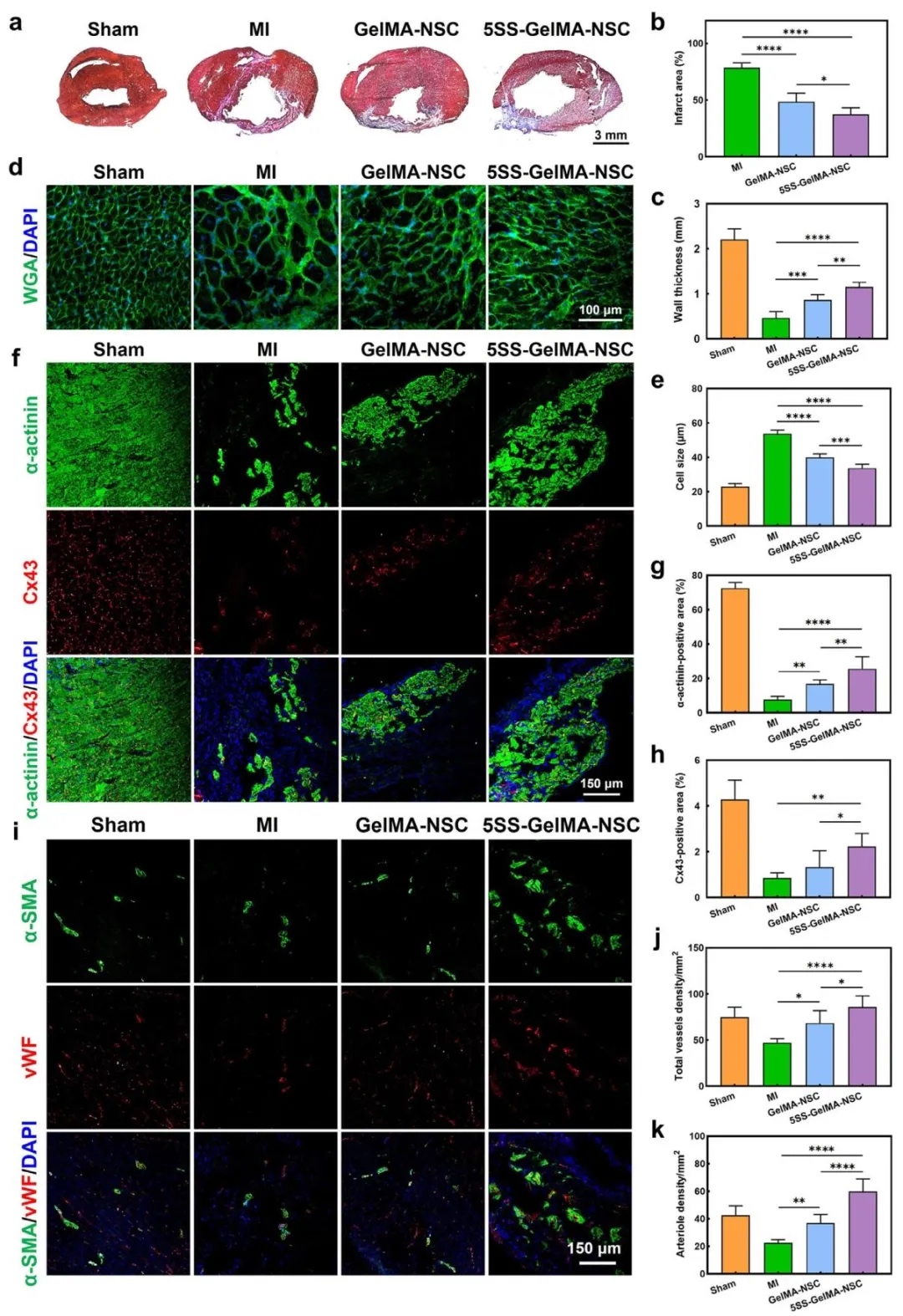6. 心肌损伤修复的组织学观察,通过Masson’s Trichrome染色、小麦胚芽凝集素(WGA)染色和免疫荧光染色,研究了支架植入4周后大鼠心肌梗死区域的组织结构修复。结果显示,5SS-GelMA-NSC组梗死区域纤维组织比例最低,左心室壁厚度最大,心肌细胞代偿性肥大显著缓解,且Cx43、α-actinin等心肌功能相关蛋白表达升高,血管密度增加。
