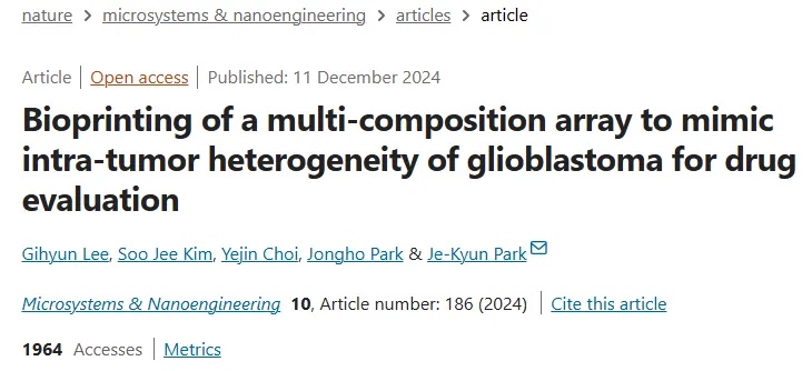 在生物打印领域,利用微挤出技术构建体外模型时,小体积水凝胶墨水易因扩散和蒸发导致打印分辨率下降、细胞活性降低,且难以在单一系统中实现高通量数据产出,限制了对肿瘤内异质性等复杂生物场景的模拟。来自韩国科学技术院(KAIST)的Je-Kyun Park教授团队开发了一种基于多生物墨水打印和气溶胶交联技术的微挤出生物打印方法,通过在打印过程中引入氯化钙气溶胶,有效抑制了纳升级水凝胶微滴的扩散和蒸发,使打印稳定性和产量提升至99%以上。该团队进一步利用多枪管喷嘴构建了包含100种不同细胞组成的胶质母细胞瘤(GBM)多成分阵列,复现了肿瘤内异质性微环境,并成功应用于替莫唑胺(TMZ)的药效评估。实验表明,该阵列可同步分析不同细胞组成对药物的响应差异,为肿瘤药物筛选提供了高通量平台。相关工作以“Bioprinting of a multi-composition array to mimic intra-tumor heterogeneity of glioblastoma for drug evaluation”为题发表在《Microsystems & Nanoengineering》上。