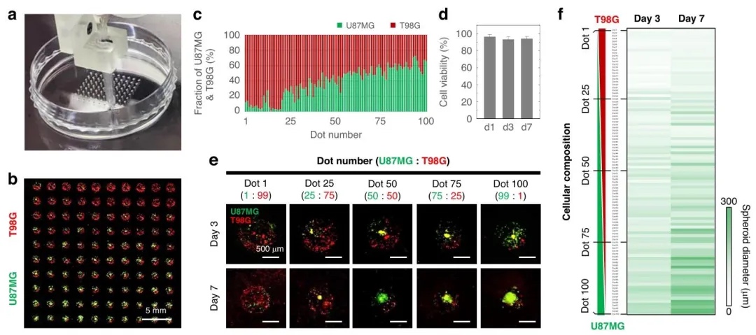 5. 模拟肿瘤内异质性的多成分GBM阵列构建,通过梯度混合U87MG和T98G细胞(比例1:99至99:1),结合荧光标记和细胞形态分析,研究了100种不同成分阵列的异质性模拟能力。结果表明,阵列中细胞组成呈线性梯度分布,且随U87MG比例增加,肿瘤球状体直径从50 μm增至300 μm,验证了微环境对细胞生长的调控作用。