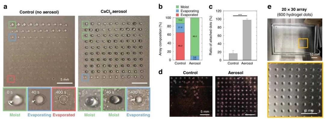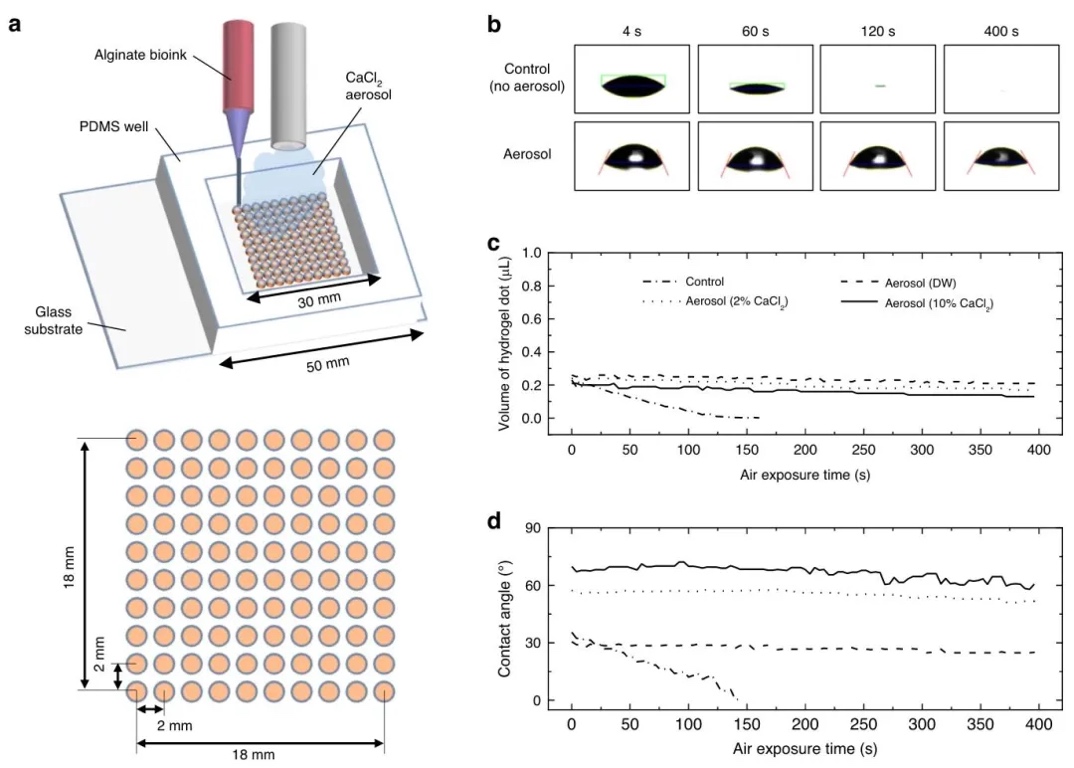 1. 基于气溶胶交联的稳定微挤出打印技术原理,通过在微挤出打印过程中引入10%氯化钙(CaCl₂)气溶胶,研究了纳升级水凝胶微滴在空气暴露下的扩散和蒸发问题。结果表明,气溶胶通过实时凝胶化和维持湿润环境,使250纳升藻酸盐微滴在400秒内体积保持率从对照组的0%提升至97%,接触角从0°增加至60°,显著改善了打印分辨率和稳定性,且10×10阵列的附着率从对照组的20%提升至97%。