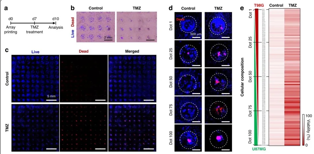 6. 替莫唑胺(TMZ)在异质GBM阵列中的药效评估,通过对790 μM TMZ处理后的阵列进行活/死染色和荧光定量,研究了细胞组成与药物响应的相关性。结果表明,U87MG比例高的微滴(51-100号)存活率<50%,而T98G比例高的微滴(1-50号)存活率>50%,皮尔逊相关系数达-0.696,证实了肿瘤异质性对药物疗效的显著影响。