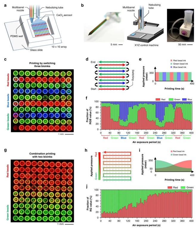 3. 多成分异质图案阵列的打印与表征,通过多枪管喷嘴结合气溶胶交联,研究了三材料切换(红/绿/蓝荧光珠)和双材料梯度混合(红+绿荧光珠)的打印能力。结果表明,阵列中荧光珠比例与气压调控的材料挤出比例高度吻合(R²>0.95),成功制备了条带化和梯度化的多成分阵列,验证了多材料精准控制的可行性。