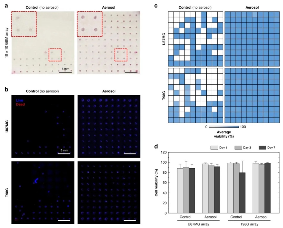 4. 生物打印胶质母细胞瘤(GBM)阵列的生物相容性评估,通过活/死染色和细胞 viability 检测,研究了含U87MG(TMZ敏感)和T98G(TMZ耐药)细胞的单成分阵列在气溶胶辅助打印后的性能。结果显示,气溶胶组细胞存活率在7天内维持>90%,显著高于对照组(<50%),且阵列附着稳定,证明了该技术在细胞封装中的适用性。