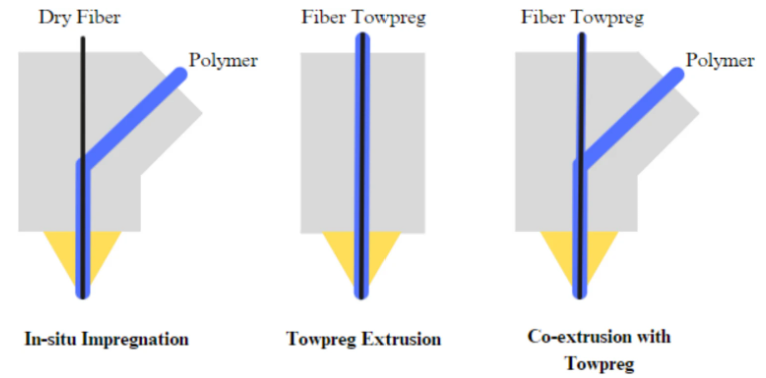 △常见连续纤维增强材料挤出 (CFR-MEX) 工艺示意图:原位浸渍、丝束预浸料挤出以及丝束预浸料共挤出。图片来自Springer Nature Link。