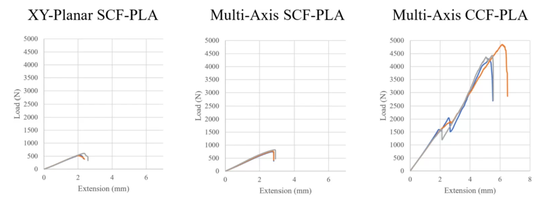 增材制造中的连续纤维增强技术此前已证明可显著提升部件性能,一些研究报告称,采用连续碳纤维增强的PLA复合材料的拉伸强度高达650 MPa。然而,传统的三轴打印方法将纤维取向限制在平面方向,从而将这些性能提升限制在XY平面内。多轴3D打印方法已证明可提高短纤维增强部件的承载能力。例如,在压力盖和曲面几何应用中,多轴打印样品的失效载荷比平面打印样品高出数倍。