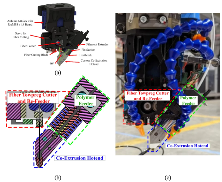 弗吉尼亚理工大学的工具集成了文献中先前工具无法同时实现的多种功能。它结合了基于双驱动挤出机的聚合物进料器、纤维切割器和再进料器组件,以及可调节相互作用时间的共挤出热端,用于纤维-聚合物粘合。针状几何形状和外部气动冷却管降低了在多轴重新定向过程中与打印部件发生碰撞的风险。测得的碰撞体积角(完整工具)为 56.2°,(热端组件)为 41.6°。
