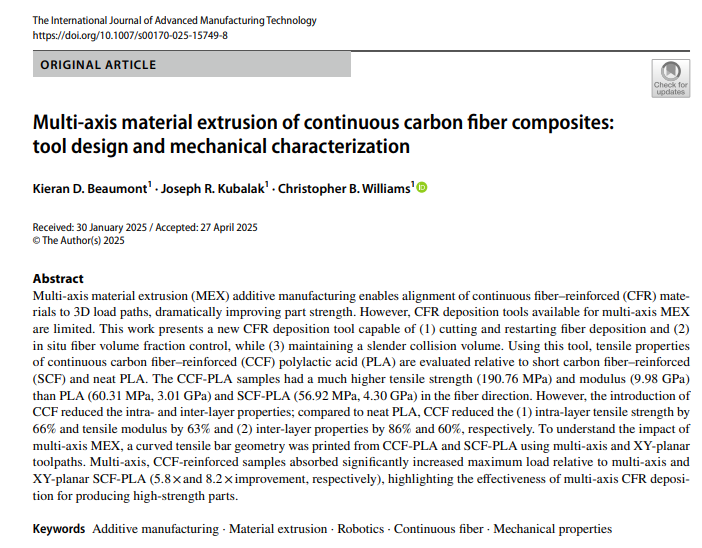 2025年6月6日,弗吉尼亚理工大学机械工程系的研究人员推出了一种专为多轴3D打印设计的连续纤维增强(CFR)沉积工具,显著提升了复合材料结构的机械性能。相关研究以题为“Multi-axis material extrusion of continuous carbon fiber composites: tool design and mechanical characterization”的论文发表在,由Kieran D. Beaumont、Joseph R. Kubalak和Christopher B. Williams领导,发表于《Springer Nature Link》期刊。