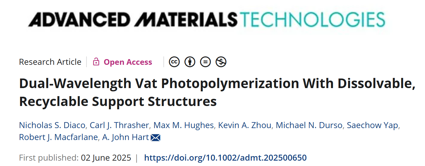 相关研究以题为“Dual-Wavelength VatPhotopolymerization With Dissolvable, Recyclable Support Structures”的论文发表在《先进材料技术》杂志上,由 Diaco 与 Carl Thrasher、Max Hughes、Kevin Zhou、Michael Durso、Saechow Yap、Robert Macfarlane 教授和 A. John Hart 教授合作完成。项目得到了香港感知与交互智能中心 (InnoHK)、美国国家科学基金会、美国海军研究办公室和美国陆军研究办公室的支持。