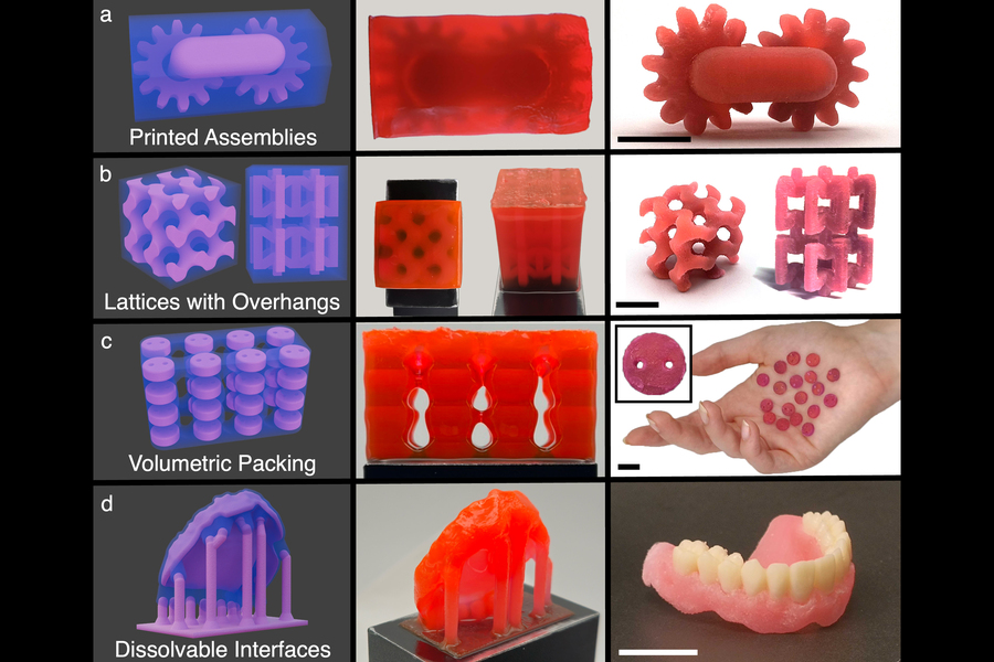 △使用新型树脂打印复杂结构,包括功能性齿轮系、复杂晶格和牙种植体。图片来自麻省理工学院。