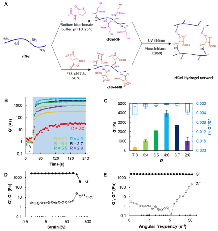 1. 水凝胶合成与流变特性,通过合成cfGel-NB和cfGel-SH功能聚合物,利用硫醇-烯“点击”化学交联,结合流变学测试(时间扫描、应变扫描、频率扫描),研究了不同cfGel-NB与cfGel-SH质量比(R)对水凝胶交联效率、刚度(G')和线性粘弹性范围的影响。结果表明,UV曝光10秒内可快速成胶,R=4:6时G'最高,水凝胶可承受100%应变未断裂,呈现低阻尼特性。