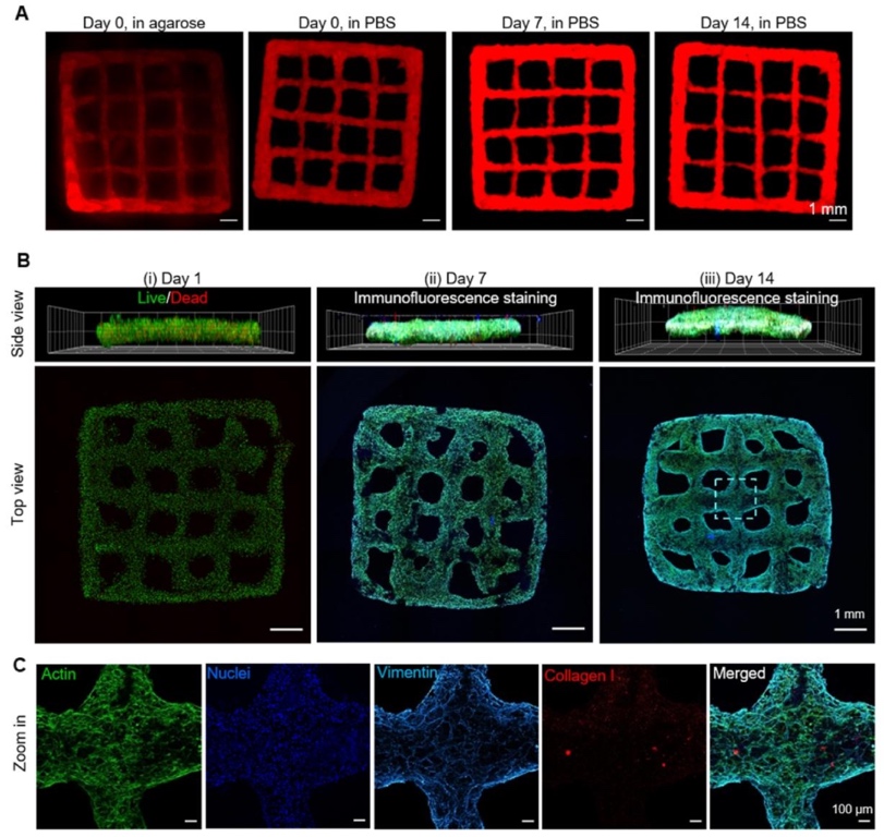 4. 细胞封装与3D生物打印,通过Alamar Blue代谢活性检测、活/死染色和免疫荧光成像,研究了人真皮成纤维细胞(HDFs)在不同浓度cfGel-水凝胶中的存活、增殖和 spreading行为。结果表明,5 wt%和7.5 wt%水凝胶支持细胞长期存活,10 wt%因刚度较高限制细胞扩散;结合FRESH技术打印含细胞的多层网格结构,证明水凝胶在2周培养中保持形状保真度,仅因细胞收缩力出现轻微弯曲。