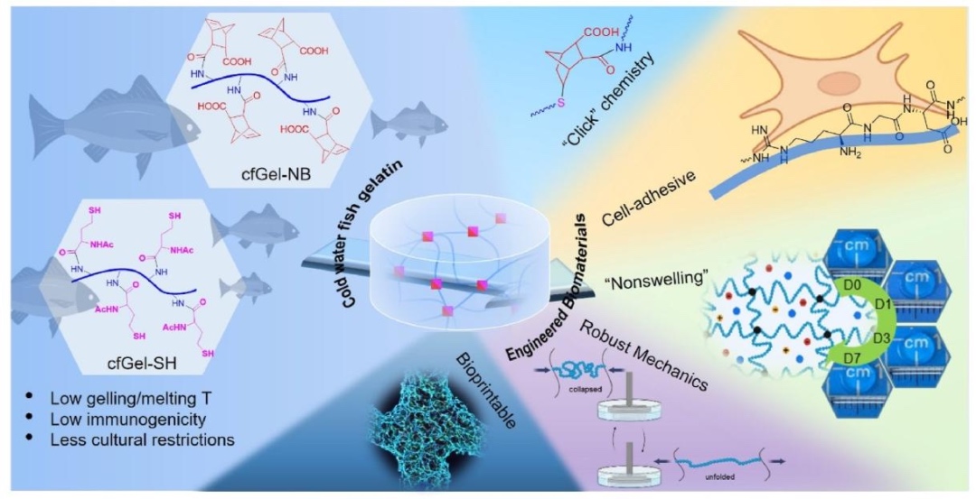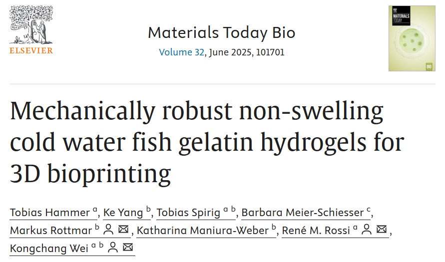 来自瑞士联邦材料科学与技术实验室的Kongchang Wei教授团队 ,联合多方开展深入研究,致力于突破这一困境。他们以冷水鱼明胶(cfGel)为原料,借助硫醇-烯“点击”化学构建了仅含单一网络的新型非溶胀水凝胶 。相关工作以“Mechanically Robust Non-Swelling Cold Water Fish Gelatin Hydrogels for 3D Bioprinting”为题发表于《Materials Today Bio》 ,为解决3D生物打印中水凝胶肿胀问题提供了创新性思路,有望推动组织工程和再生医学领域的发展。