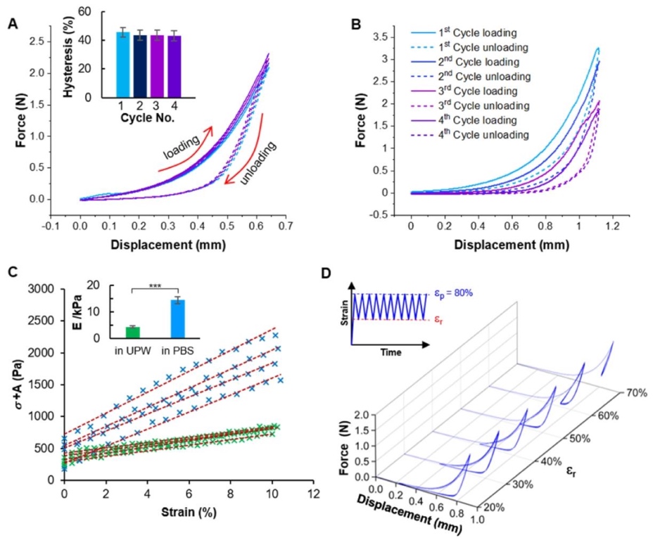 3. 机械性能与分子机制,通过循环压缩测试、杨氏模量测量和橡胶弹性理论计算,研究了水凝胶在PBS和UPW中的力学响应及分子链构象变化。结果表明,PBS中受限溶胀使水凝胶具备高机械稳健性(承受80%压缩应变,滞后率>40%),而UPW中溶胀导致力学性能下降;分子链在PBS中的构象收缩率达49%,交联点间距缩短,解释了能量耗散与快速恢复特性。