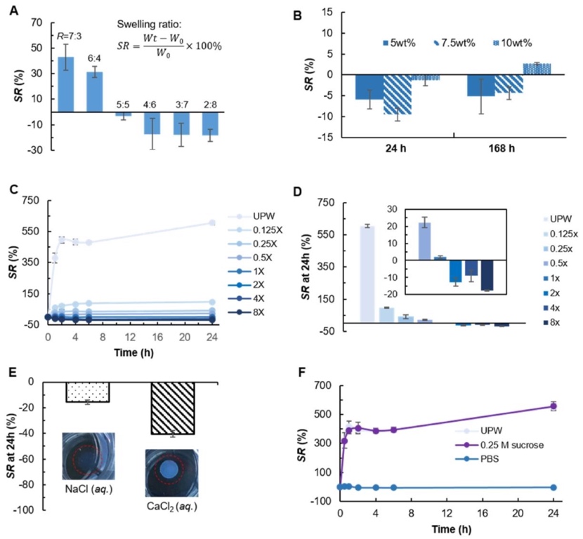 2. 生理条件下的非溶胀特性,通过在不同浓度PBS、超纯水(UPW)、NaCl和CaCl₂溶液中测量溶胀率(SR),研究了cfGel-水凝胶的溶胀行为与离子强度的关系。结果表明,R=5:5的水凝胶在PBS中溶胀率<±10%,表现为非溶胀;高盐溶液(如8×PBS)导致脱水收缩,而低离子强度溶液(如UPW)引发显著肿胀,Ca²⁺通过与明胶羧酸基团相互作用增强脱水收缩。