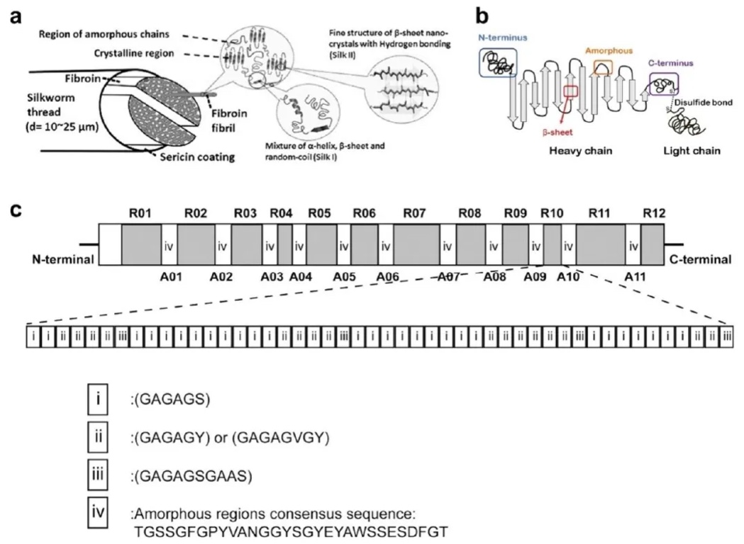1. 丝纤维和丝素蛋白结构示意图,通过扫描电镜观察、氨基酸序列分析及分子动力学模拟,研究了天然蚕丝纤维及丝素蛋白(SF)的多层次结构。结果表明,蚕丝纤维由两根包裹丝胶的SF长丝组成,单根长丝由纳米原纤束构成;SF分子含重链(~391 kDa)、轻链(~25 kDa)和糖蛋白(~30 kDa),重链中甘氨酸(45.9%)、丙氨酸(30.3%)等形成的重复序列模块(如GAGAGS、GAGAGY)通过氢键驱动β-折叠结晶区形成,疏水区模块(i、ii)与亲水区模块(iv)的协同作用决定了分子组装行为。