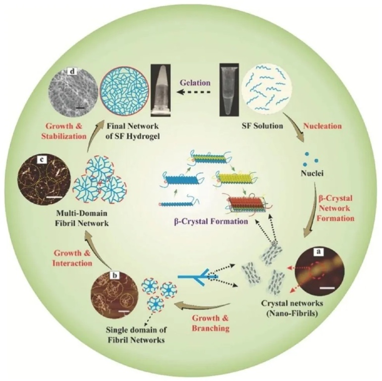 2. 丝素蛋白水凝胶通过分子组装和结晶过程的形成示意图,利用时间分辨圆二色光谱(CD)、傅里叶变换红外光谱(FTIR)及透射电镜(TEM),研究了SF水凝胶的凝胶化机制。结果表明,凝胶化过程分为“成核-生长-网络稳定”三阶段:SF分子先自组装形成β-折叠晶核,随后晶核生长为纳米纤维并分支形成单域纤维网络,最终通过氢键、疏水作用和静电作用交联成三维凝胶;凝胶动力学受SF浓度(如7.2 wt% SF凝胶时间比0.6 wt%缩短7天)和分子量调控,高浓度或高分子量加速β-折叠聚集。