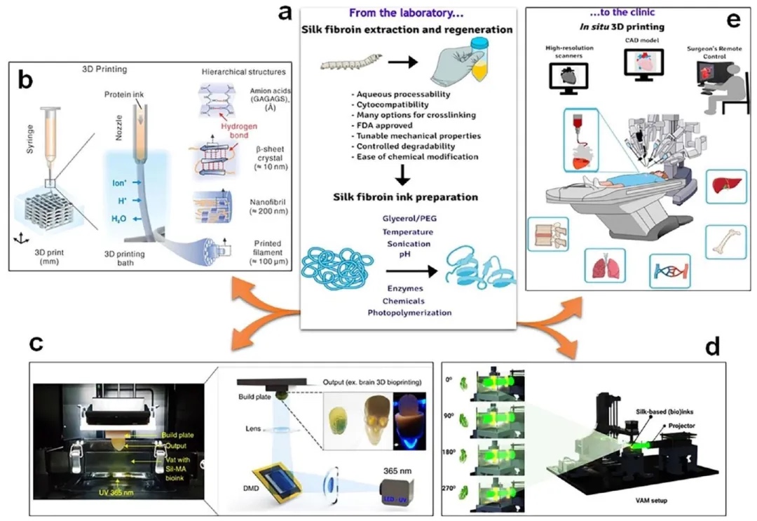 5. 基于丝素蛋白生物墨水可调凝胶过程制备丝绸支架的3D打印系统示意图,通过数字光处理(DLP)、挤出式生物打印及原位交联技术,研究了SF生物墨水在复杂结构制造中的应用。结果表明:① DLP技术利用甲基丙烯酰化SF光交联,可打印分辨率达100 μm的血管网络和心脏模型,支持软骨细胞黏附与分化;② 挤出式打印结合钙离子触发交联,可制造含梯度孔隙的骨组织工程支架,与生物玻璃复合后促进成骨细胞矿化;③ 原位打印系统(如FRESH技术)通过可逆嵌入悬浮水凝胶,实现低黏度SF墨水(10% w/w)的3D结构成型,细胞存活率超90%。