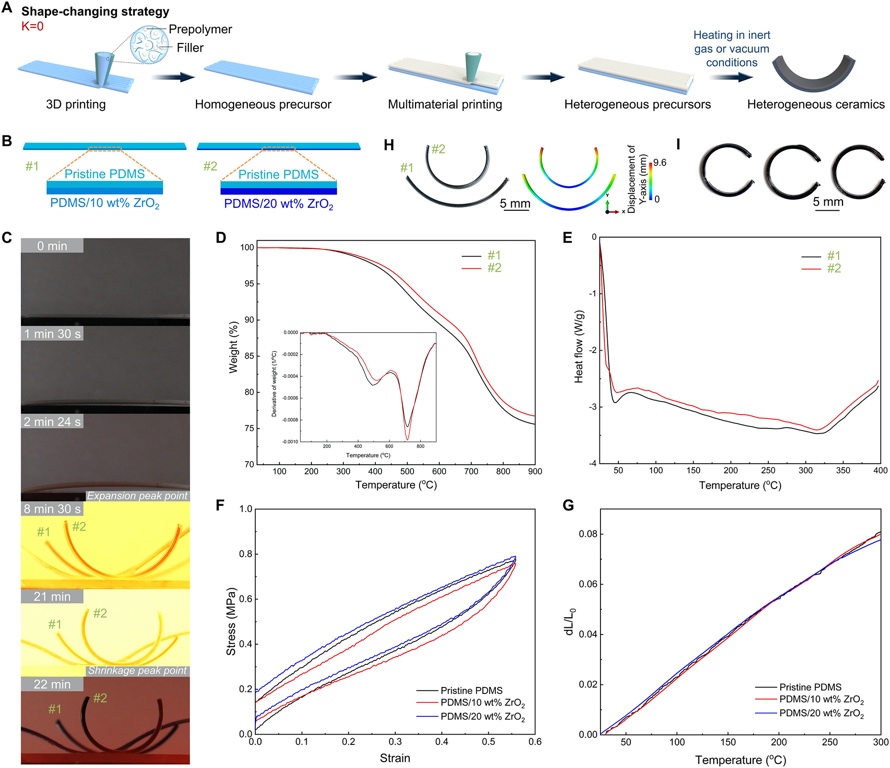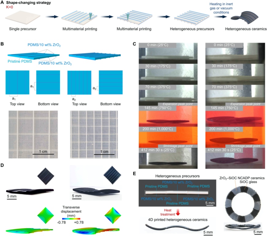文章详细介绍了材料的制备方法,包括使用聚二甲基硅氧烷(PDMS)和氧化锆(ZrO2)纳米颗粒制备前体墨水,以及使用不同的填料浓度来控制热收缩率。还介绍了3D/4D打印的具体步骤,包括使用不同的墨水进行打印、固化和热处理,以实现陶瓷化和形状变化。