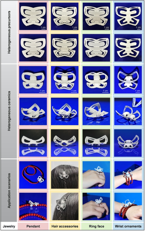 文章还讨论了将减材制造技术(如激光雕刻/切割)与形状变化/保持策略相结合,以提高异质陶瓷的3D结构分辨率和4D变形精度。这种方法可以应用于制造高精度的陶瓷艺术品和珠宝装饰,提供了一种新的制造复杂形状和高分辨率异质陶瓷的途径。